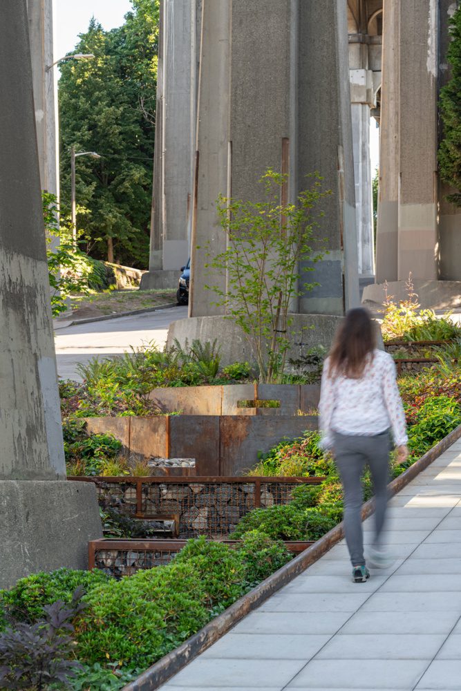 Metal edging along the Aurora Bridge Swales protects the plants from pedestrian traffic.