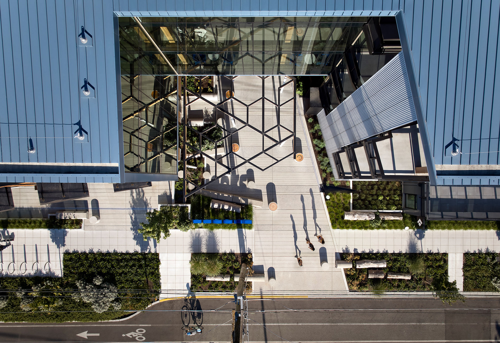 At the entrance to the building, a honeycomb-like timber canopy welcomes employees and visitors. It foreshadows a feature they’ll discover on site: a ‘periscope’ that provides a peek into the honeybee apiary on the roof of the building.