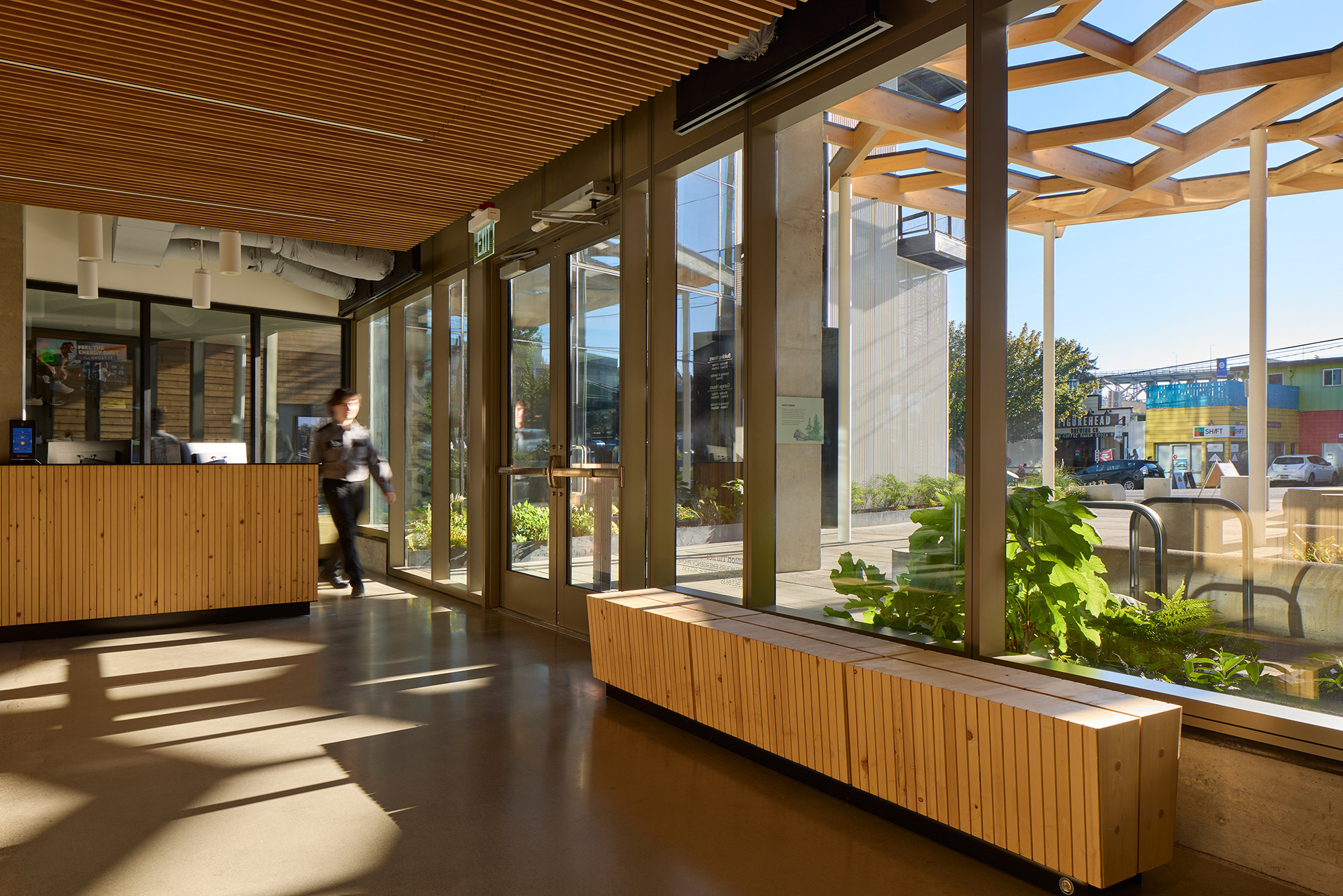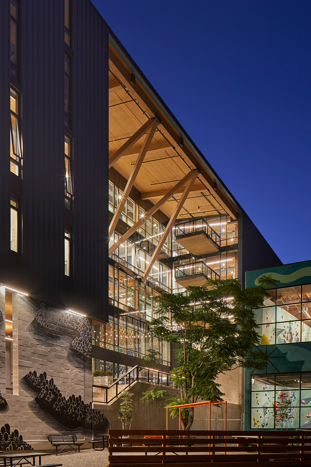 The building leverages the strength of a Dowel Laminated Timber (DLT) floor system with a glulam structural frame that reduces the building’s carbon footprint compared to steel and concrete construction. The warmth of the Douglas Fir interior provides a visual reminder of the building’s connection to nature and honors the region’s historic timber industry.
