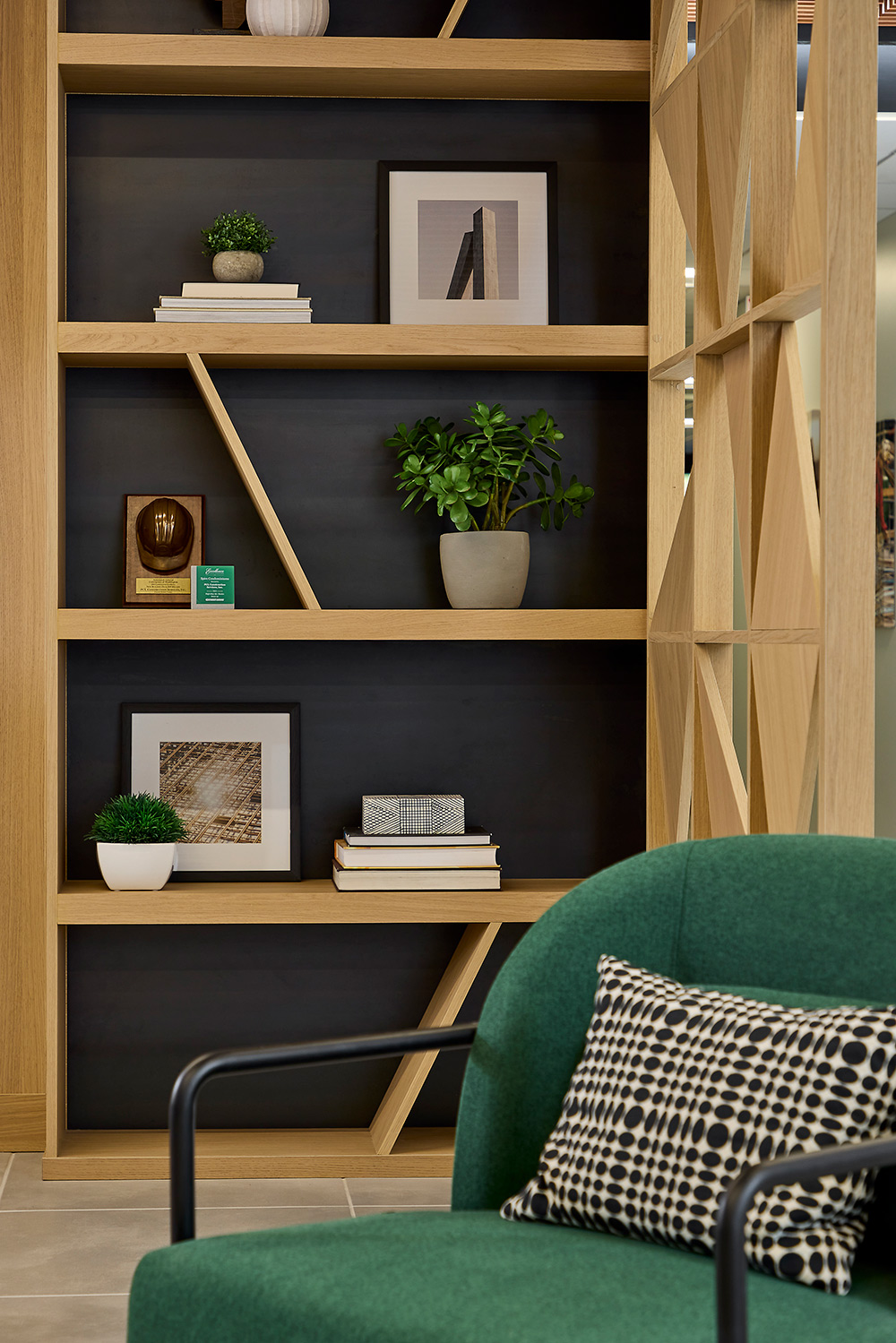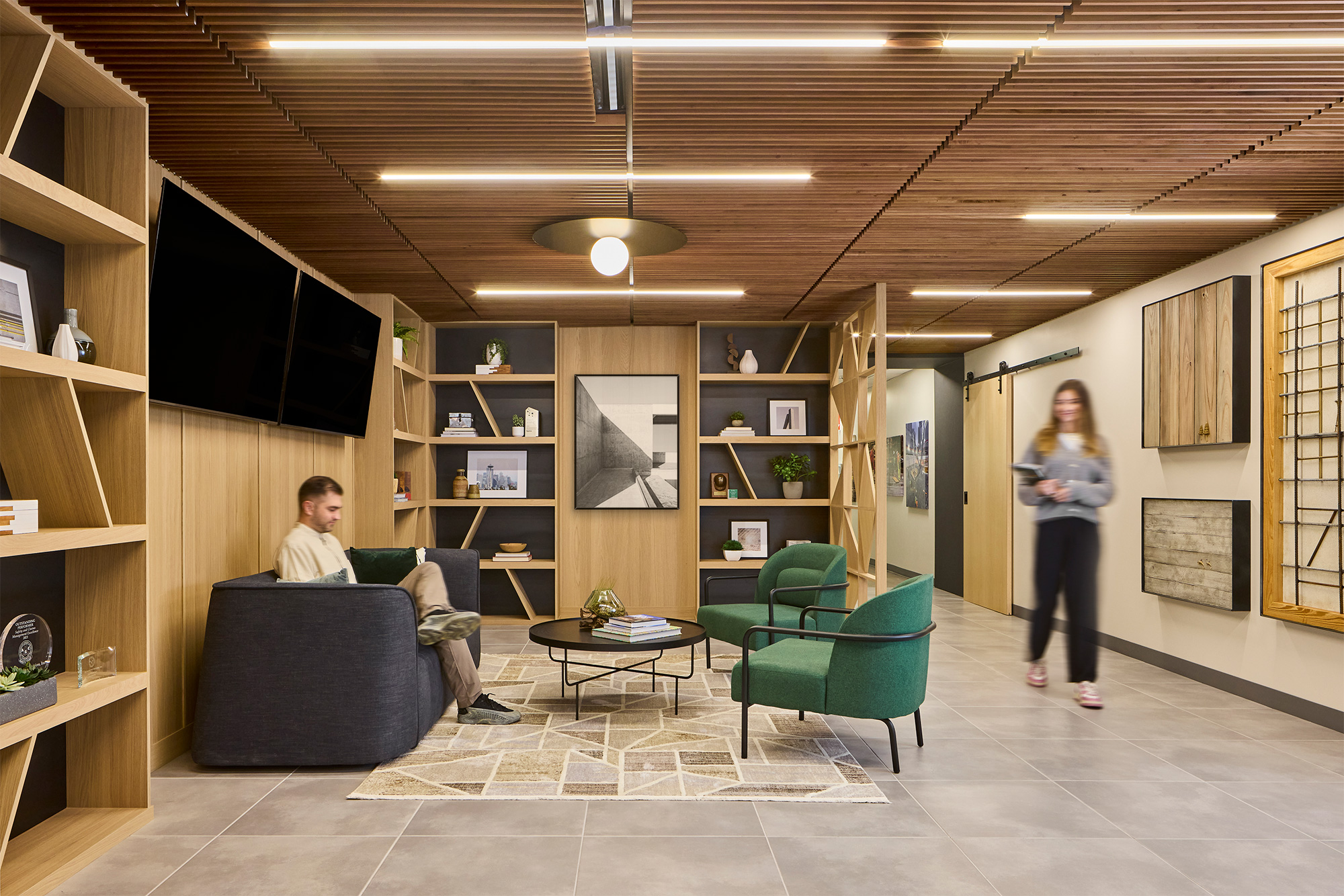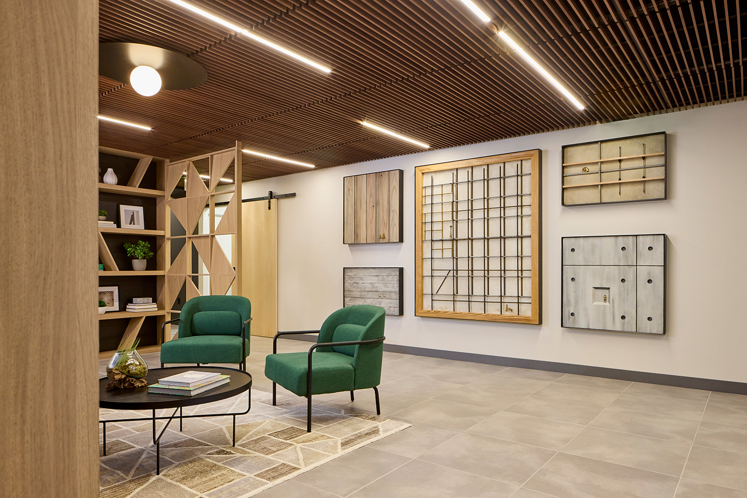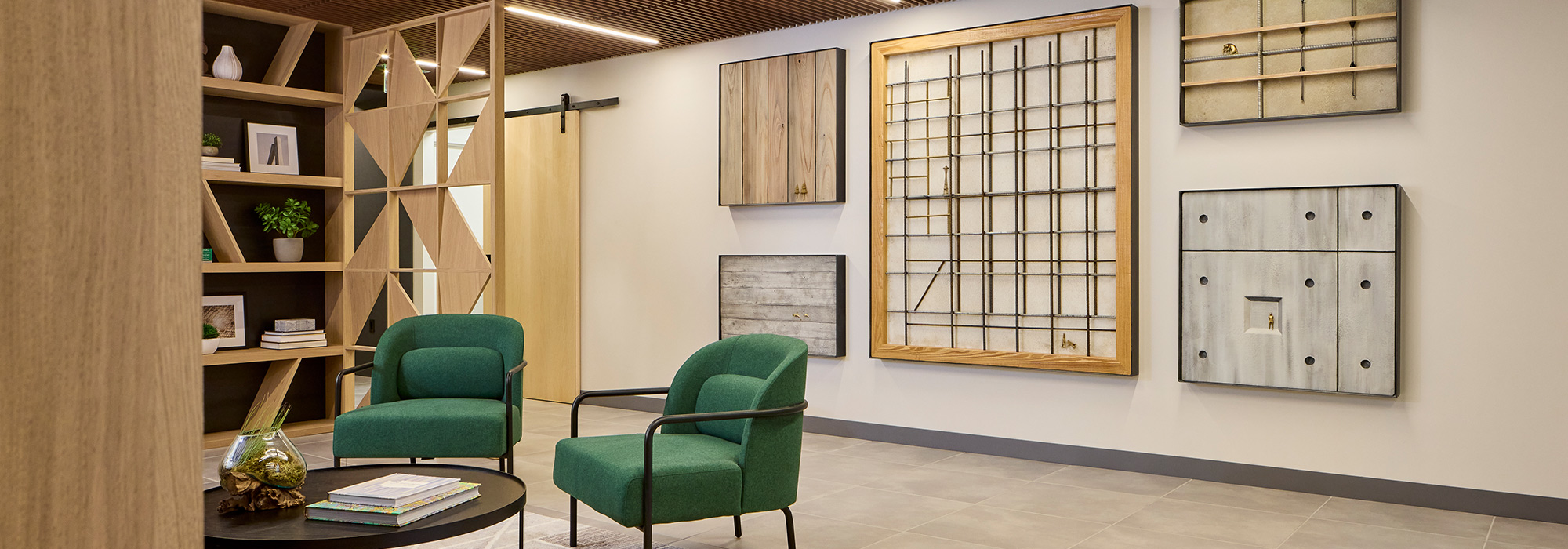 End-cut lumber panels, chevron patterns, and decorative screens merge wood, rebar and weathered steel while shadow boxes featuring whimsical and locally inspired bronze figures speak to the warm, collaborative nature of the company and its new office.