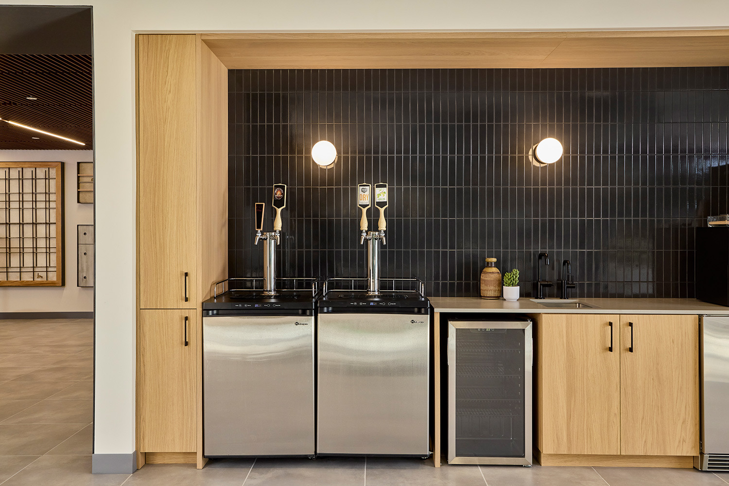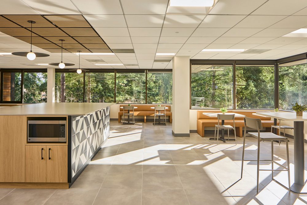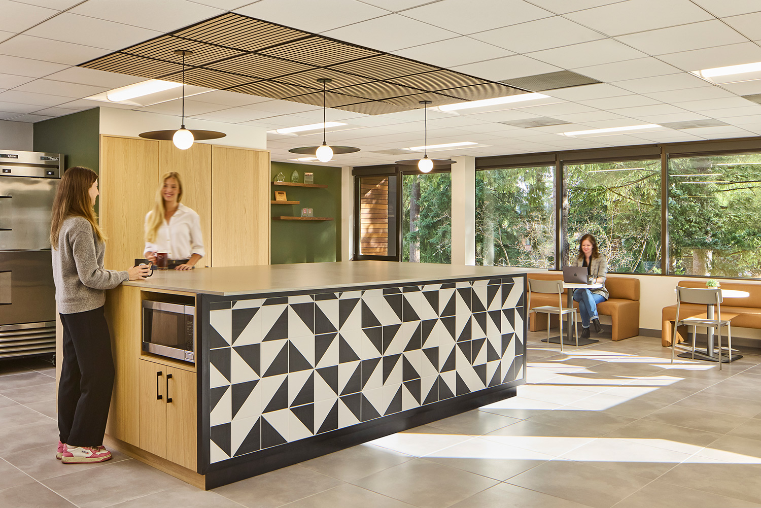 A spacious kitchen serves as a central gathering space, offering ample seating and room for conversation. Easy access encourages informal connection and coffee breaks without disrupting focused work. Black-and-white chevron tile at the heart of the space provides another understated reference to PCL’s brand language.