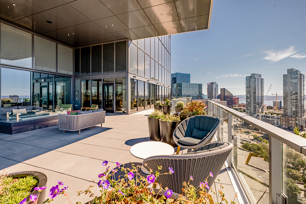 Wherever possible, the building embraces a sophisticated design aesthetic. This has as much to do with the location and proximity to neighborhood galleries and amenities as it does with design choices. The rooftop is one such example. Residents experience views of Seattle’s oldest park canopy, the adjacent and recently restored Denny Park. This lush green view further enhances the spectacular rooftop experience.