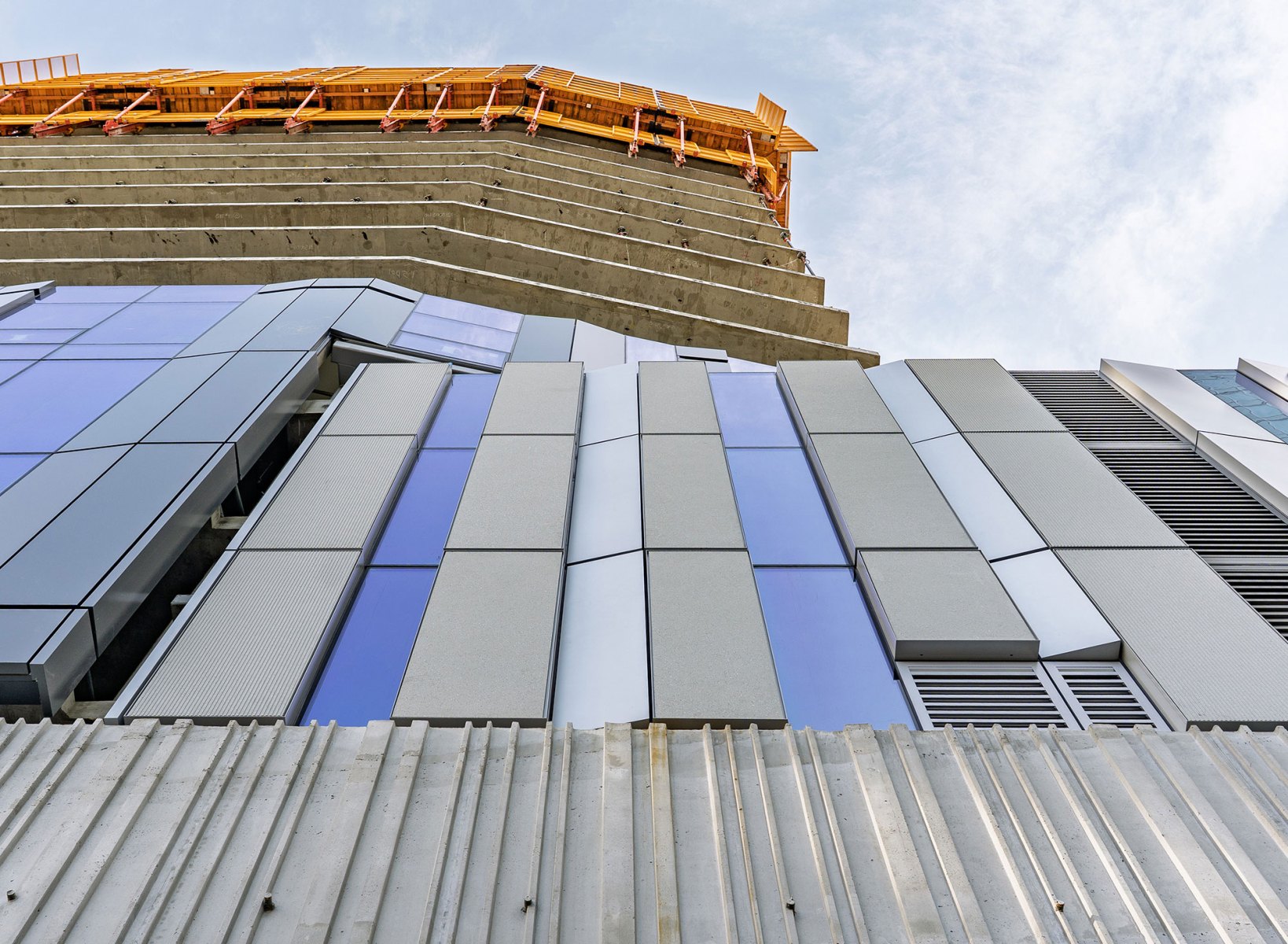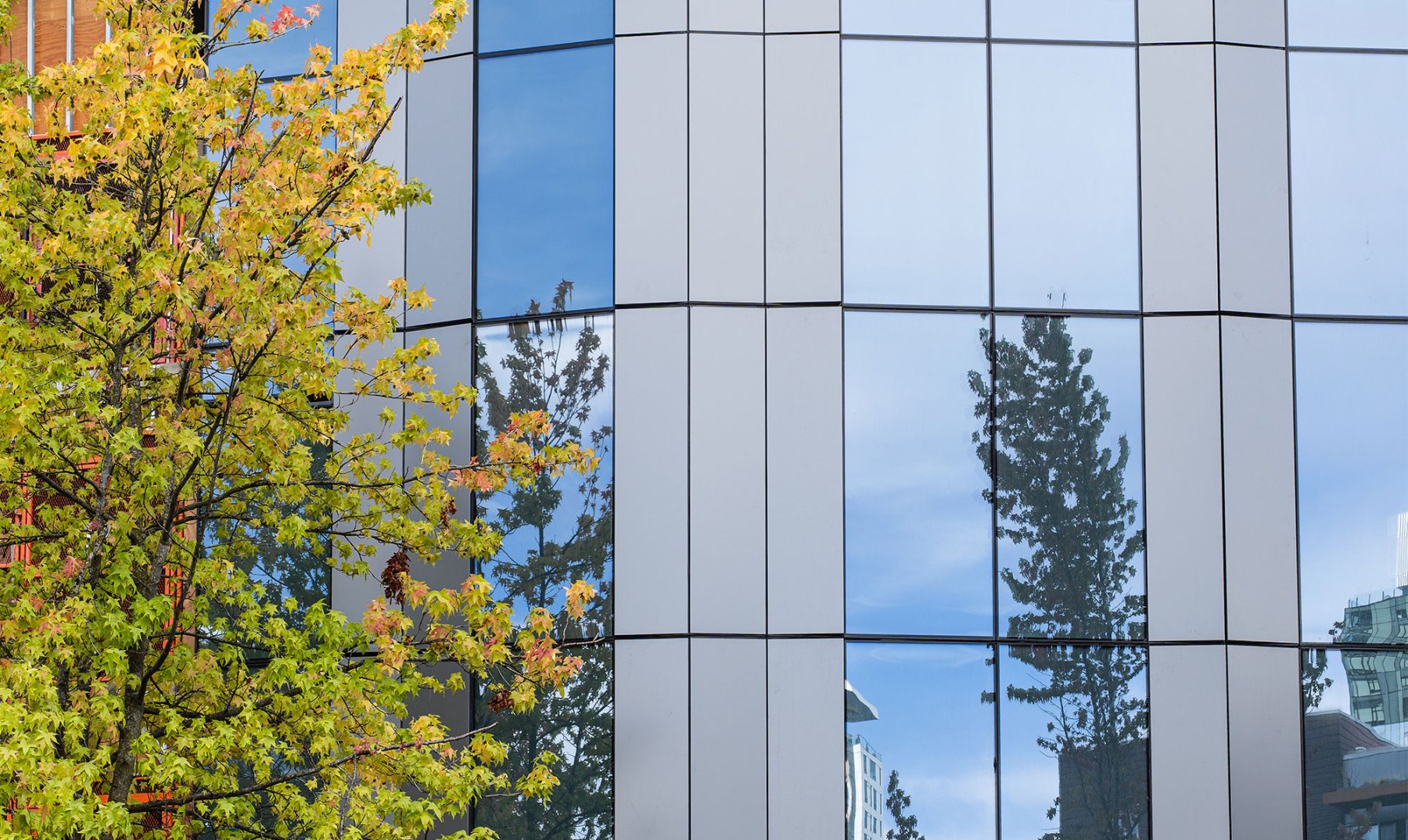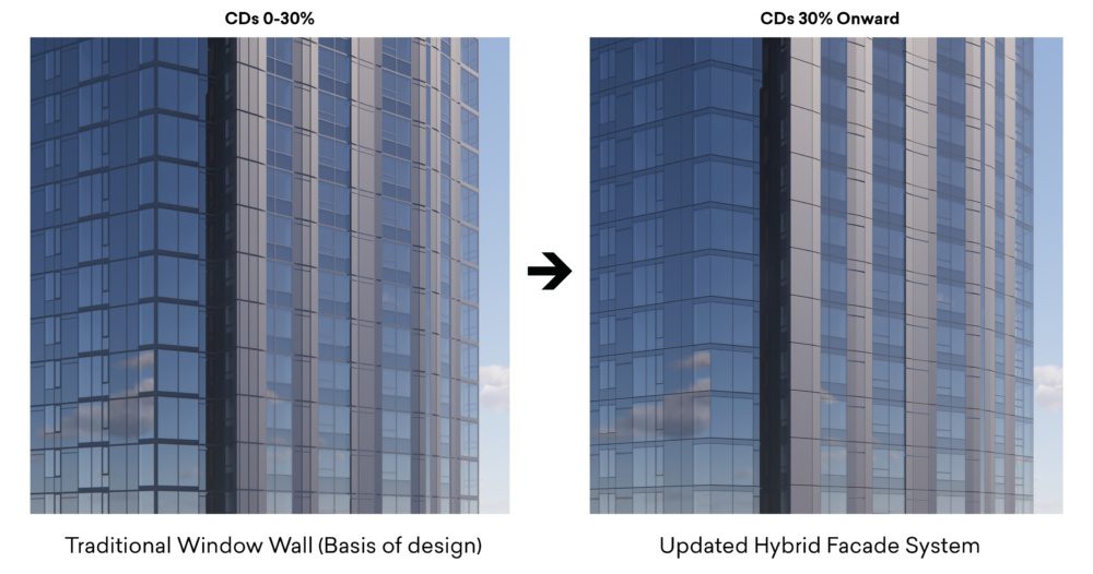 If you visit the site today, the main design detail you might notice is how the design shifts from a captured system, where mullions are visible, to a structurally glazed system, where they’re hidden. The result is a smoother, more streamlined façade that reflects the sky and surrounding neighborhood.