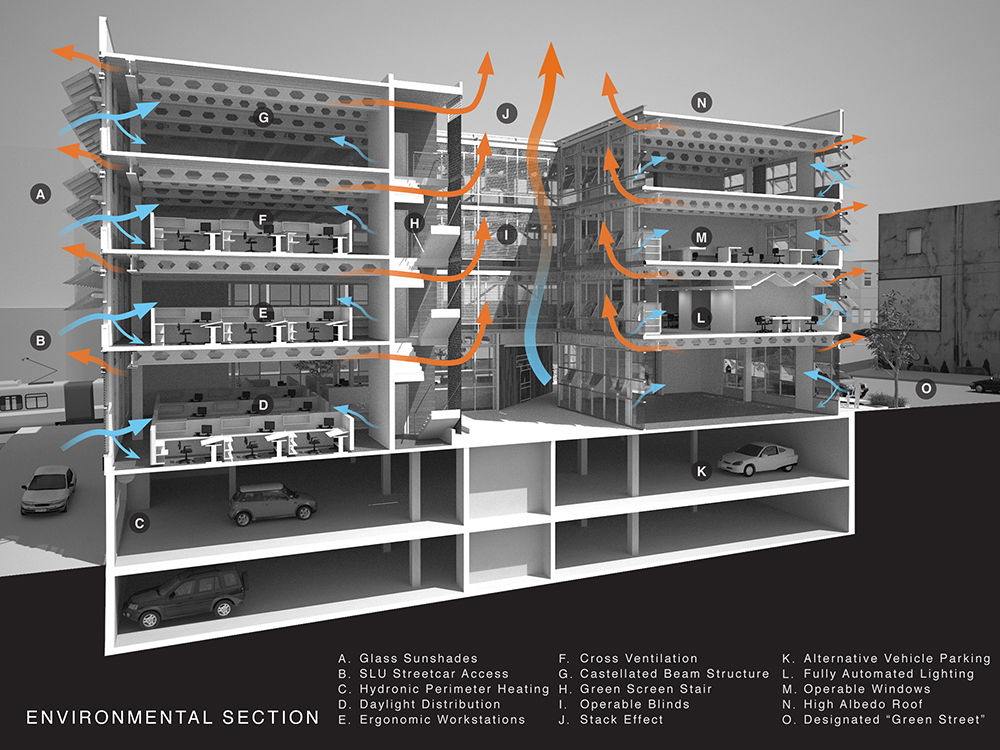 The team explored many ways to optimize the balance between heat gain and daylighting while minimizing energy usage to identify the best design strategies. Passive ventilation (with no air conditioning) became a real option with an internal courtyard working as a chimney to draw air through the building on hot days.